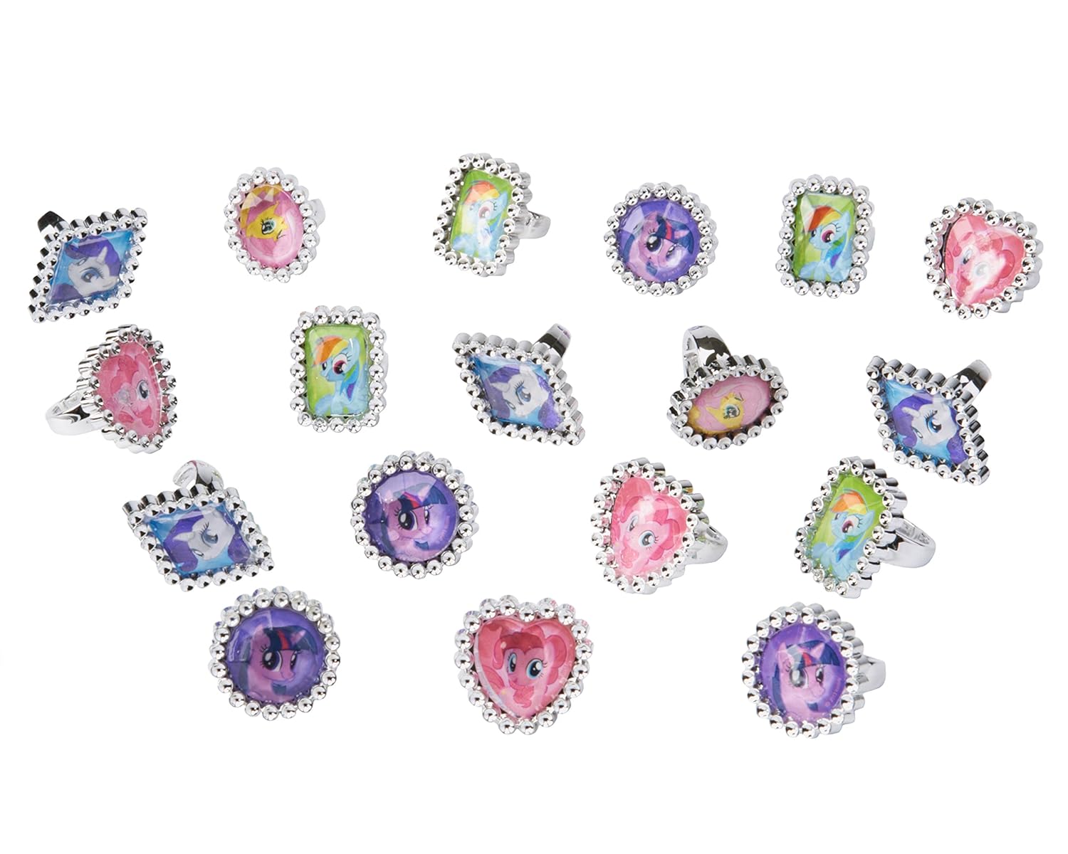 My Little Pony Jewel Rings Add more magic to your child's My Little Pony birthday party with these sparkling jewel rings! My Little Pony rings feature Twilight Sparkle, Rarity and other pretty ponies surrounded by metallic silver ornamentation. Circular, diamond, rectangular and heart-shaped rings make perfect party favors and dress-up accessories for the birthday girl and all her best friends. Rings have adjustable plastic bands. Package includes 18 My Little Pony rings. - 18 plastic rings 5 assorted designs and shapes One size fits most children Sparkling My Little Pony rings come in circular, diamond, rectangular and heart shapes and feature Twilight Sparkle, Rarity and other ponies