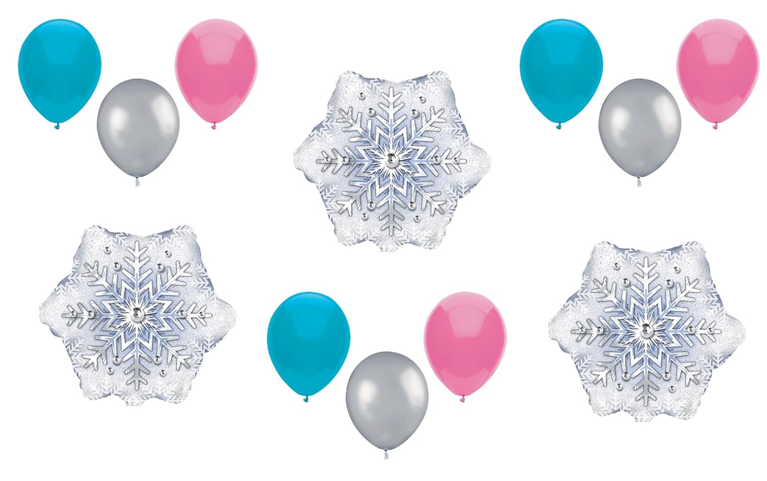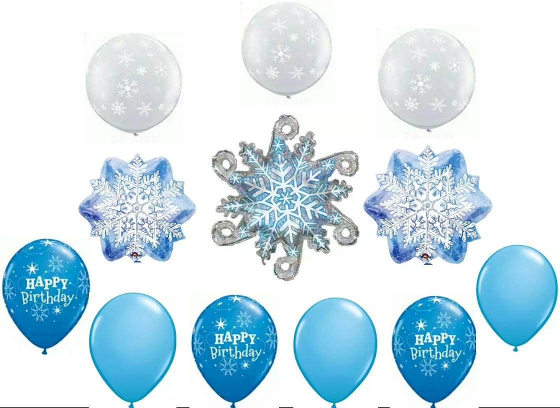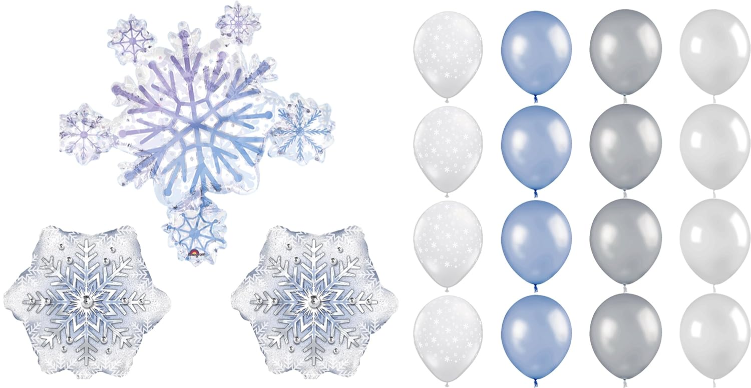 Snowflake Party Balloon Decoration Kit With 19 Balloons Total Celebrate your Frozen Party/Event with these decorative high qaulity balloons perfect for helium filling. You will receive with this kit: (1) 32" Prismatic Snowflake mylar balloon! (2) 18" Snowflake Prism Dazzler mylar balloons. (4) 11" Clear Snowflake latex balloons. (4) 11" Blue Pearl latex balloons. (4) White Pearl latex balloons. (4) Silverlatex balloons. All balloons are new and shipped uninflated. Just add helium!