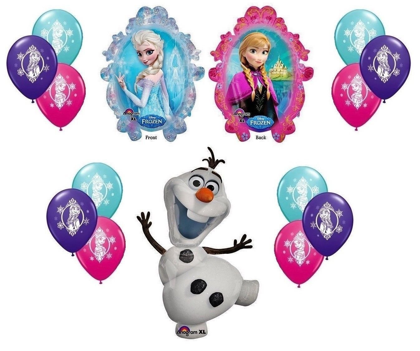 Disney Frozen Themed Balloon Bouquet Assortments Include 14 (uninflated) Mylar/Foil - Latex Balloons Per Package Pkg/1 (1) 31 Inch Disney Frozen Olaf Mylar/Foil Balloon (1) 31 Inch Disney Frozen Sisters (Double Sided) Mylar/Foil Balloon (12) 11 Inch Frozen Latex Assorted Hot Pink, Turquoise and Lavender