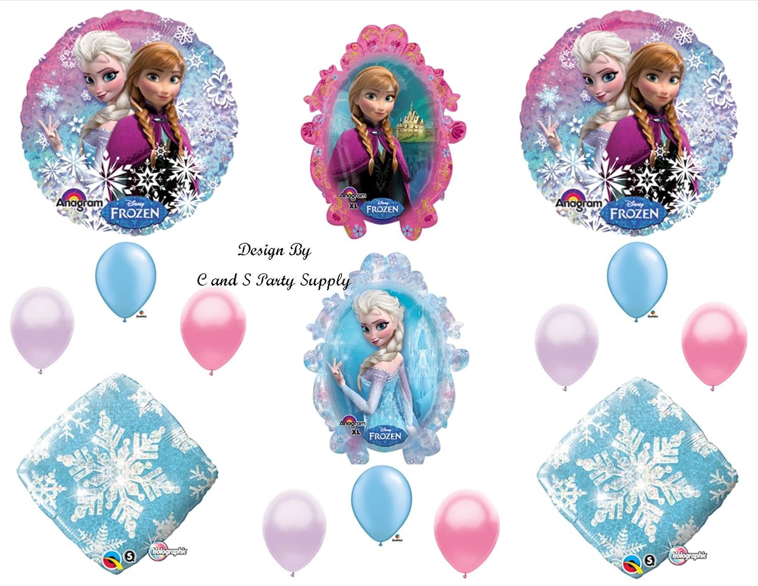 Disney Frozen Party Balloon Decoration Kit With 12 Balloons Total Celebrate your Frozen Party/Event with these decorative high quality balloons perfect for helium filling. You will receive with this kit: Three (3) 18" Snowflake Prism Dazzler mylar balloons. (3) 11" Silver latex balloons. (3) 11" Blue latex balloons. (3) Pink latex balloons. All balloons are new and shipped uninflated. Just add helium!