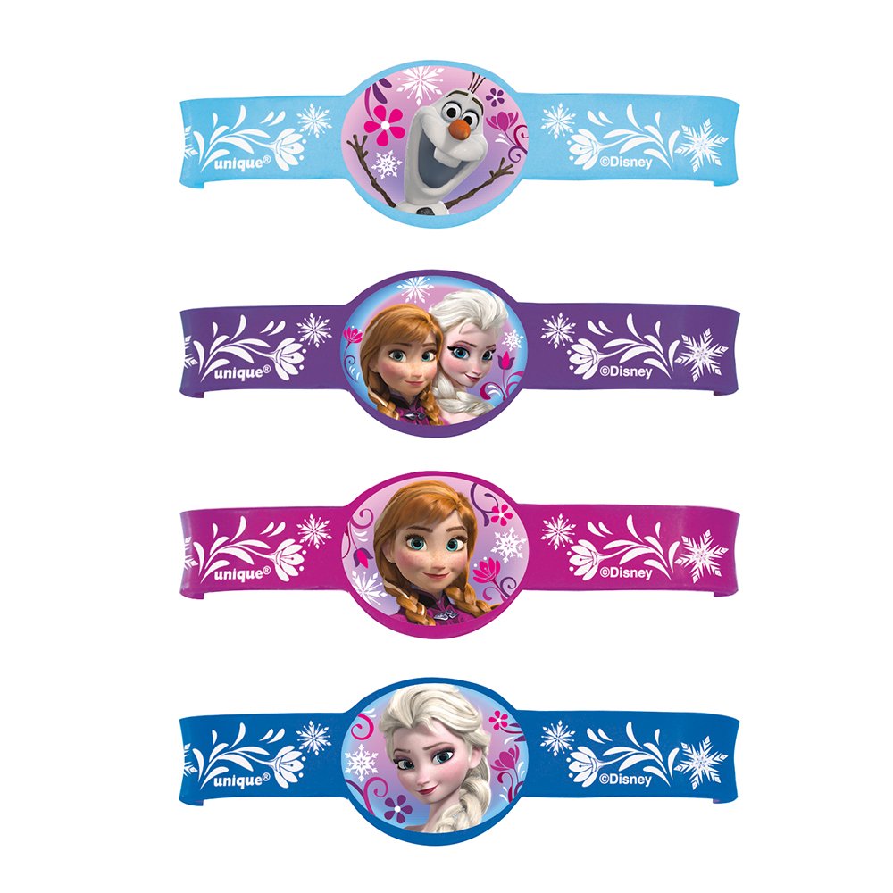 Package of 4 Disney Frozen Bracelets Disney Frozen Rubber Bracelets come in 4 different colors Each bracelet has a pendant with different images of Anna, Elsa, or Olaf Perfect party favor for any little Frozen fan