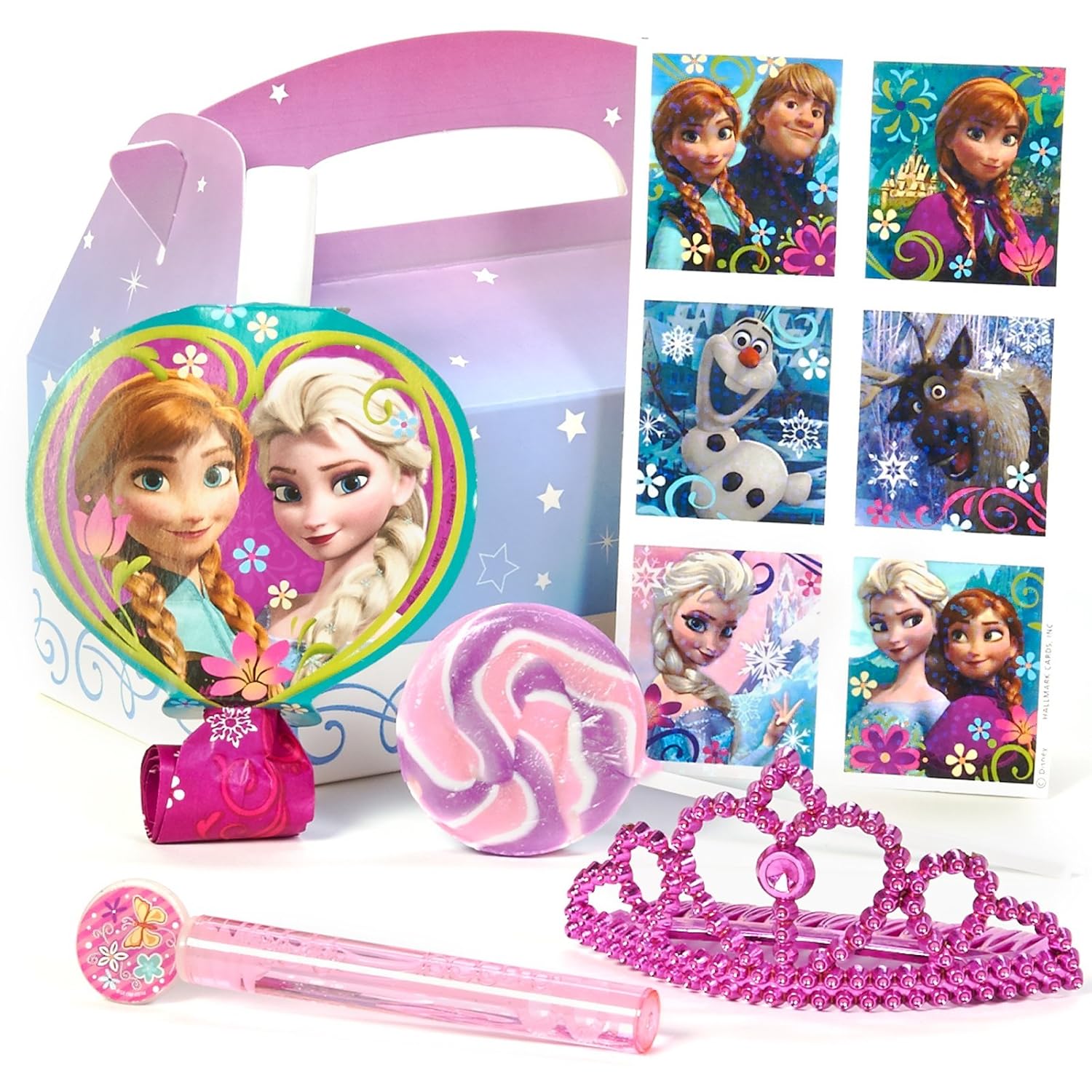 Have the coolest party with this Frozen product! Disney Frozen - Party Favor Box includes a Disney Frozen Sticker Sheet, Disney Frozen Cupcake Ring, Candy Filled Shoe, Bubble Wand, and Ice Cream Lip Balm.This is an officially licensed Disney product.