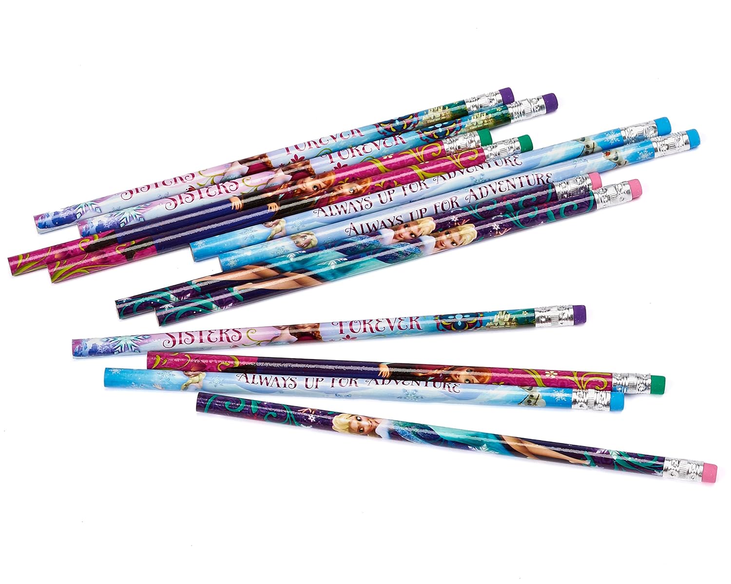12 No. 2 pencils 4 colorful designs Contrasting erasers It's winter in Arendelle! These fun Frozen wooden pencils feature Elsa the Snow Queen, Princess Anna and the loveable snowman, Olaf! Perfect party favors for a kids birthday party or Disney's Frozen themed party