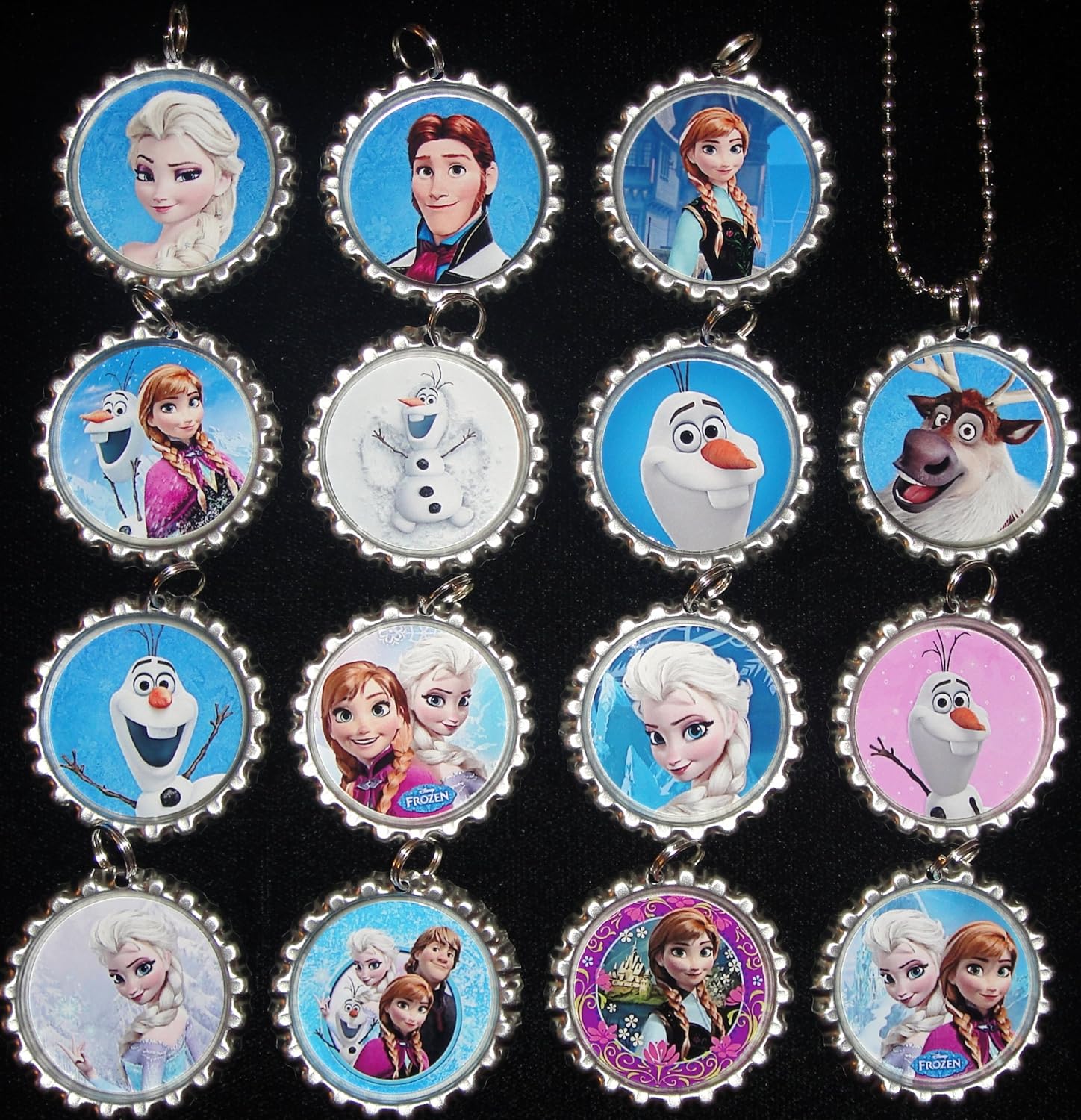 15 Frozen theme bottle cap necklaces, Each comes with an 18" ball chain necklace, 1" bottle cap and an epoxy dome over each image which gives each necklace a 3-D image to it. They are not waterproof.