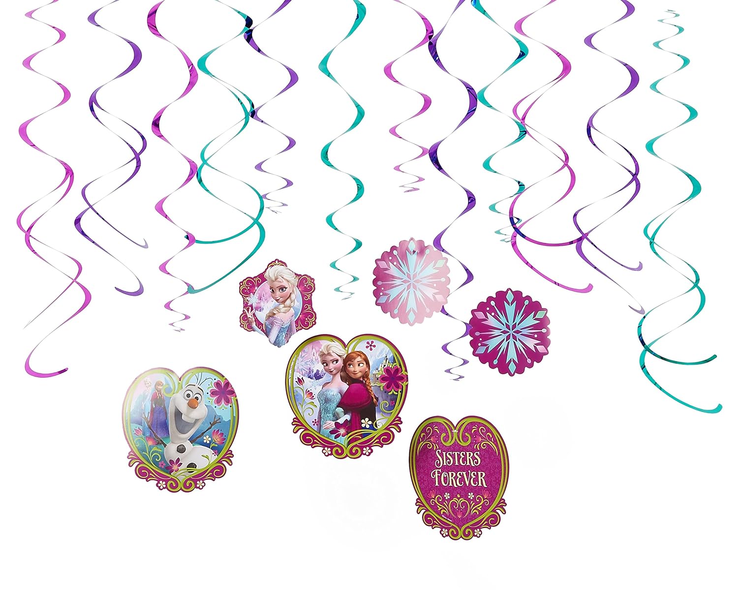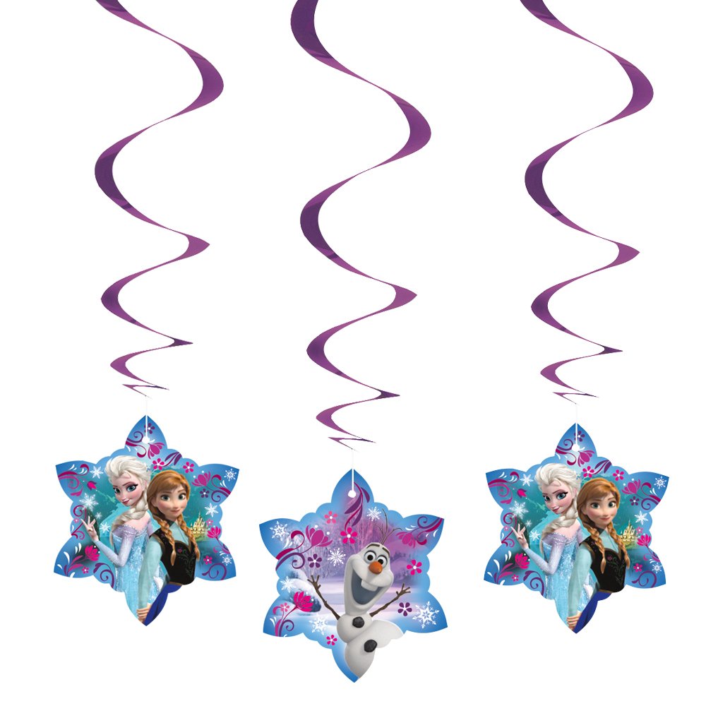 Package of 3 Disney Frozen Hanging Swirl Decorations Disney Frozen Hanging Swirl Decorations measure 26" long Feature purple foil swirls and snowflake cut outs with Anna and Elsa on one side and Olaf on the other An enchanting decoration for and Frozen theme party