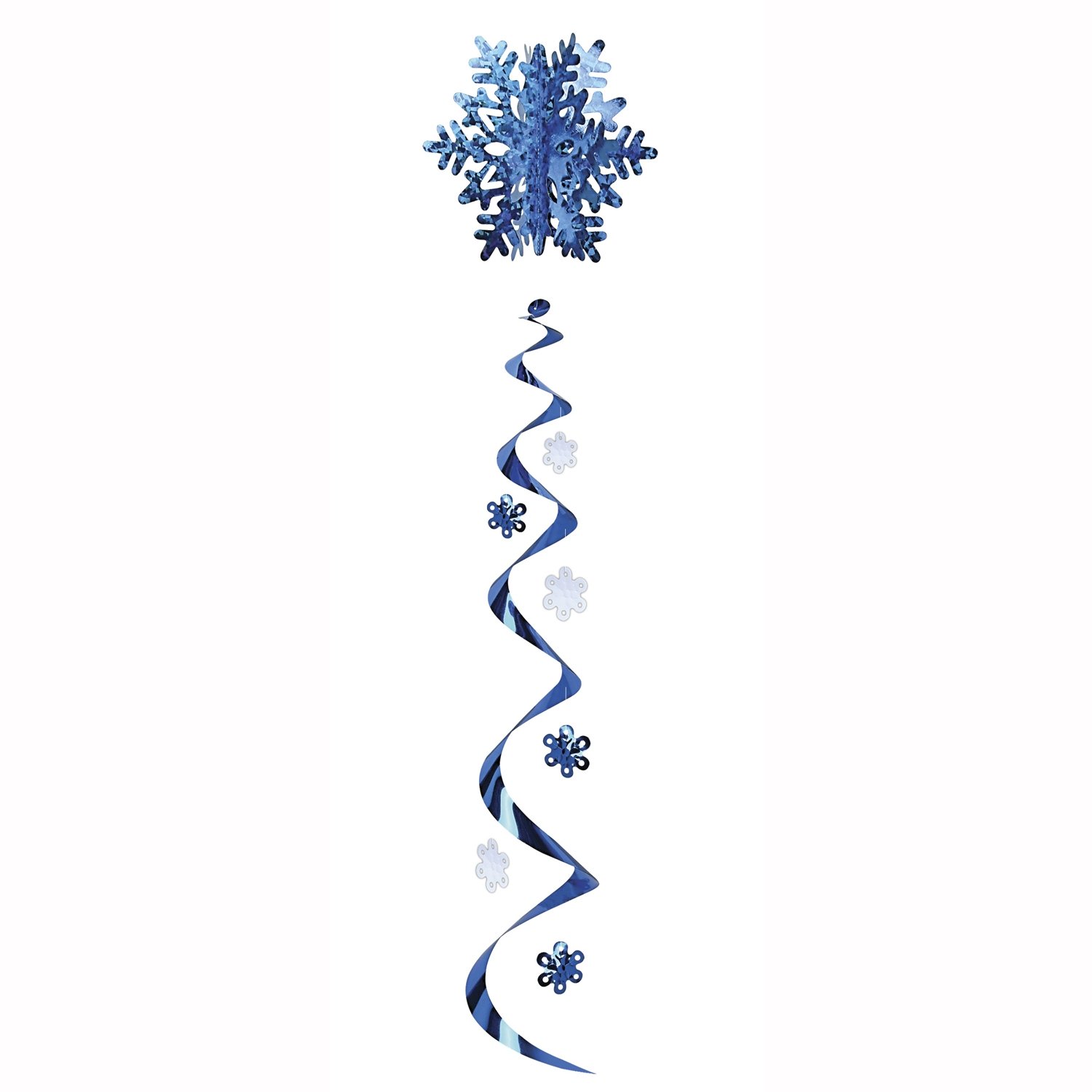 Jumbo Snowflake Whirl. Shiny blue whirl with a large blue prismatic foil snowflake at the top and smaller randomly attached assorted blue and white snowflakes, this 4 foot whirl come completely assembled. Use the whirl to decorate and add color to any room. This item is a great value! 1 Per package Winter/Christmas party item Hanging Decs - Whirls for festive occasions High Quality