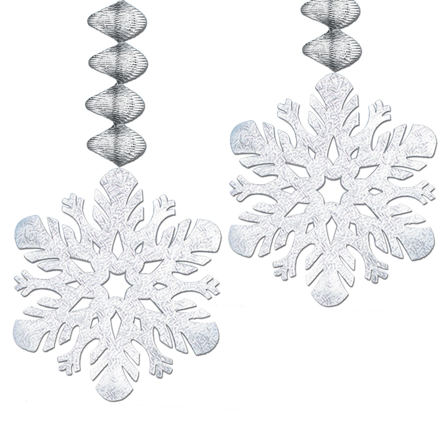 Foil Snowflake Danglers (2 Count). These danglers have silver spirals and foil board stock snowflakes. They are 30 Inch long. They are a great item to hang for the Winter time!. This item is a great value! 2 Per package Winter/Christmas party item Hanging Decs - Danglers for festive occasions High Quality