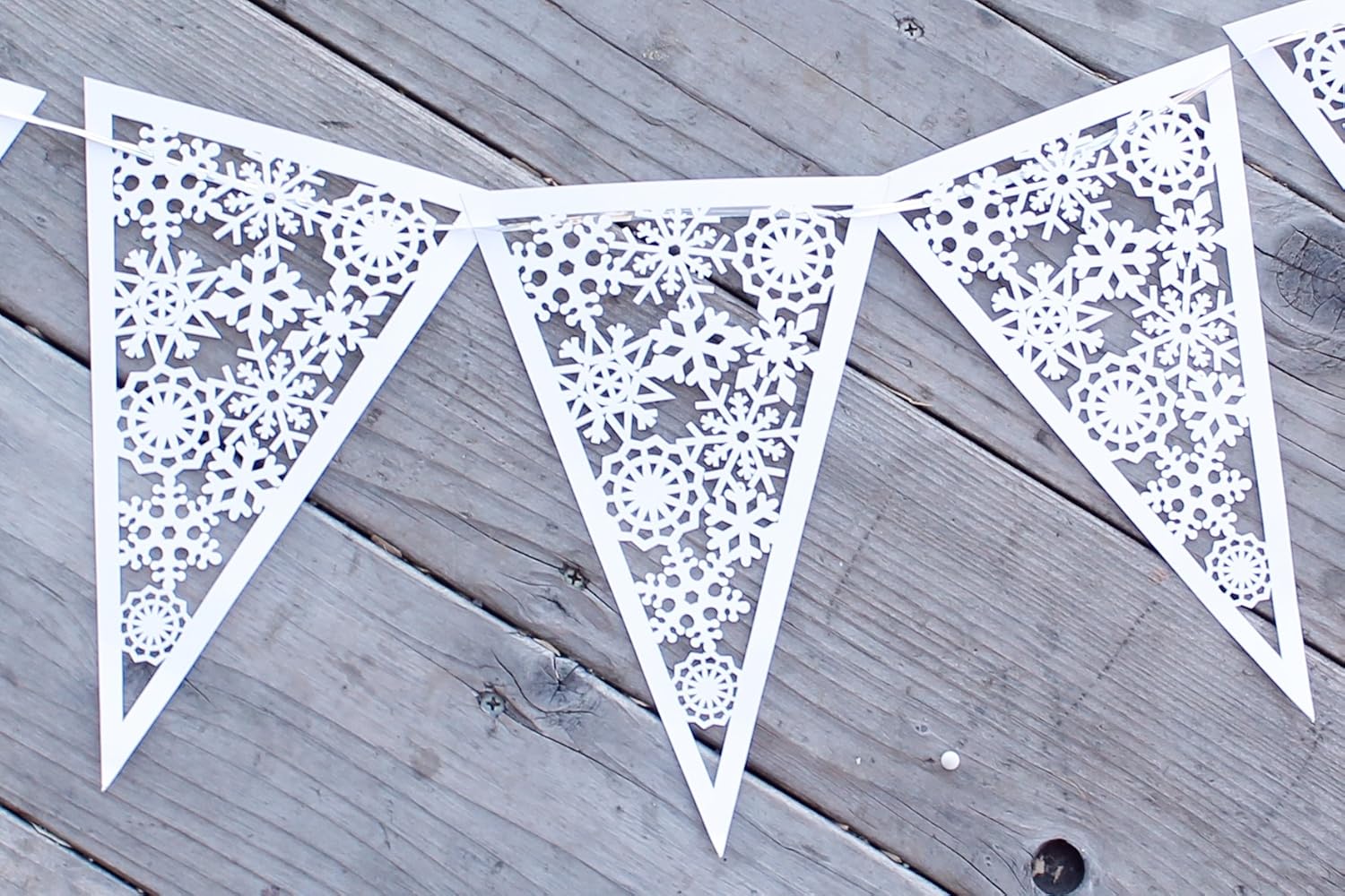 Triangle Pennant Flags with laser cut snowflake pattern You will receive 10 blank flags (NO ribbon or twine will be included) Would be perfect for a Frozen birthday party or holiday decoration. Made from heavy white colored card stock Reusable