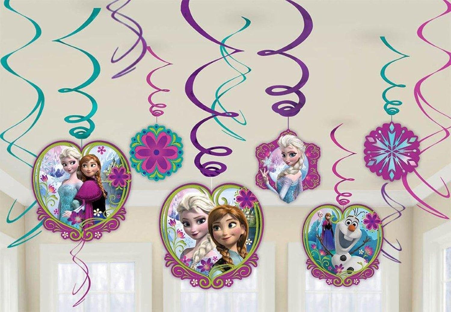 12-piece, swirl decoration value pack! Package includes 6 foil swirl decorations, 3 foil swirl decorations with 7 in. cutouts, and 3 foil swirl decorations with 5 in. cutouts 6-ft. string decorations provide up to 36 ft. of decorating! It's winter in Arendelle! These fun Frozen hanging decorations feature Elsa the Snow Queen, Princess Anna and Olaf! Perfect party decorations for a kids birthday party or Disney's Frozen themed party