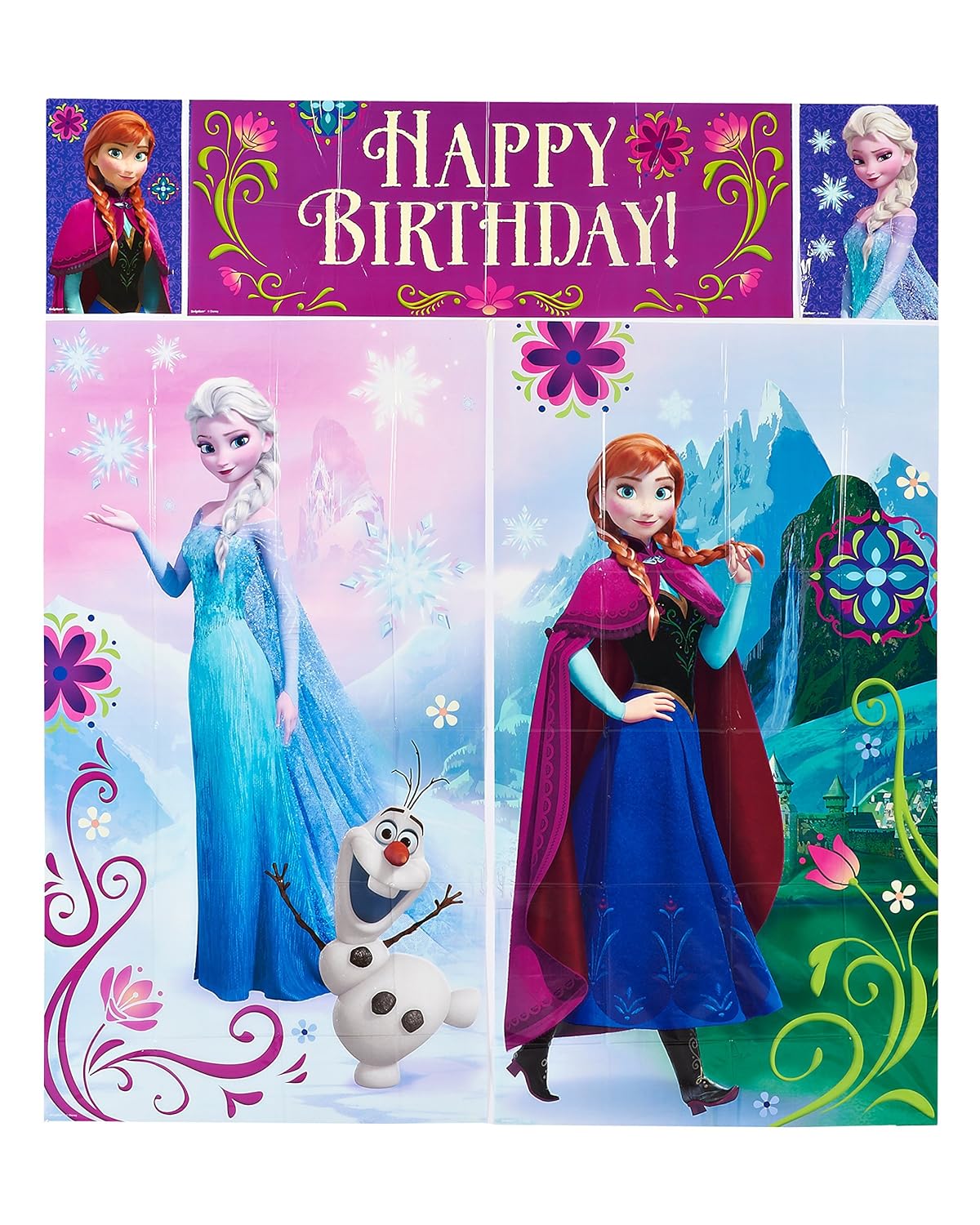 5-piece wall decorating kit Over 6 ft. tall It's winter in Arendelle! This fun Frozen party decorating kit features Elsa the Snow Queen, Princess Anna, and Olaf! Perfect American Greetings party supplies for a kids birthday party or Frozen themed party Also great as a background for taking pictures at the party!